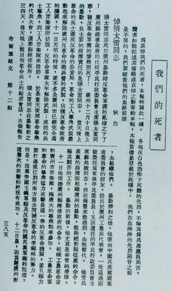 廣州起義失敗后,1928年1月2日,瞿秋白撰《悼張?zhí)淄尽罚?/span>1月9日在《布爾塞維克》第12期發(fā)表。