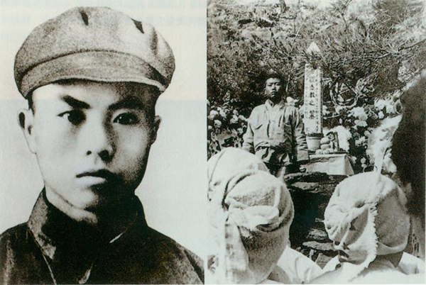 1952年1月2日,志愿軍戰(zhàn)士羅盛教在平安南道成川郡石田里,為搶救跌入冰窟的朝鮮少年而犧牲。被授予“中國人民志愿軍一級(jí)模范”稱號(hào)。左圖為羅盛教,右圖為被救少年崔瑩在羅盛教墓前。